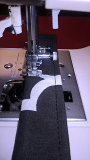 Na koniec pozostaje nam tylko obrębić materiał aby się nie strzępił, można to zrobić tuż po wycięciu elementów, ale ja obszywam na końcu - oszczędzam czas ponieważ szyję dwie warstwy materiału. Wykorzystuję do tego celu ścieg owerlokowy, u mnie nr 11 oraz ustawienie na elastyczne szycie ( to małe pokrętło z różowym znacznikiem).